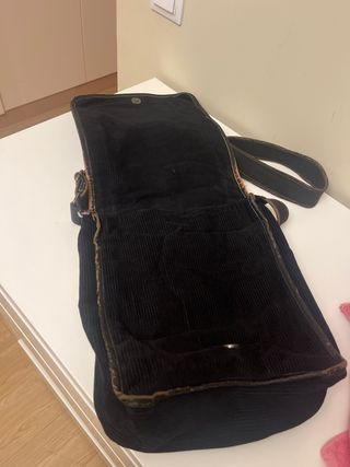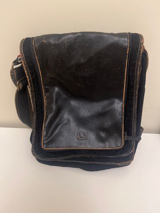 Bandolera de piel con un diseño envejecido y detalles en contraste. Tiene un montón de bolsos y caben muchas cosas. Mide unos 35 cm de alto por unos 25 de ancho. - Material: Piel y pana. - Color: Negro y marrón.