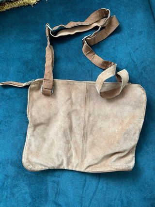 Estilosa bandolera de lona en tono beige con detalles en piel marrón. - Cierre principal con solapa y hebilla. - Bolsillo frontal con cierre. - Correa ajustable. - Asa de piel. - Compartimentos exteriores. - Tiene una pequeña mancha en la parte delantera (se ve en las fotos), habría que lavar esa zona.