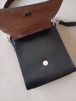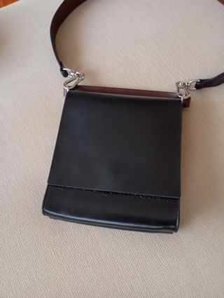 Bolso pequeño de piel de Adolfo Domínguez. Medidas aprox 22 x 19 x 5 cm. Rígido. Ada corta y larga. Tiene un rascazo poco perceptible en trasera, hay foto. Funda guardapolvo. - Color negro y detalles en marrón. - Cierre con botón a presión.