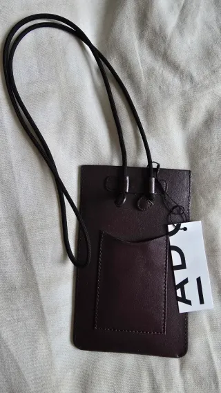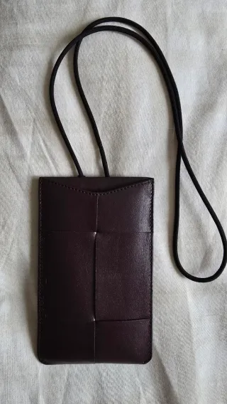 Este portamóvil está hecho de piel y tiene un diseño tejido. - Cierre superior. - Incluye un cordón negro para llevarlo colgado.