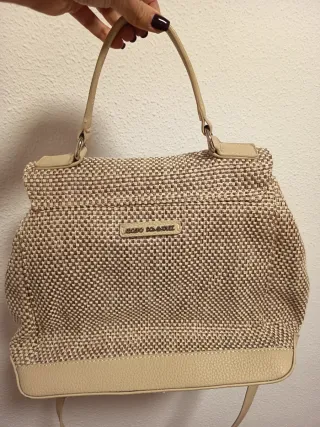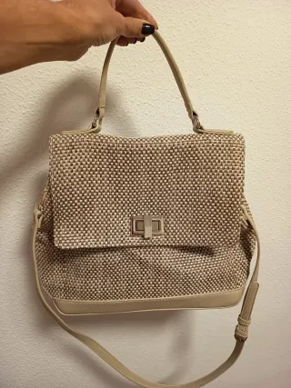 Elegante bolso de Adolfo Domínguez con un diseño tejido y piel - Combinación de colores beige y marrón. - Asa de mano y correa para hombro. - Cierre metálico frontal. -5 departamentos en su interior -Nuevo, sin usar. Perfectas condiciones - Precio no negociable