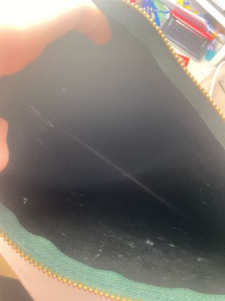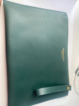 Preciosa funda o neceser de la marca Adolfo Domínguez. Es de color verde y tiene un diseño elegante y sencillo. Esta valorado en 50€ pero como esta manchado por dentro bajo el precio - Material: Piel sintética. - Cierre: Cremallera. - Asa de mano.