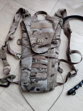 Mochila de combate Altus, sin estrenar. Perfecta para tus aventuras al aire libre. - Diseño camuflado multicolor. - Cierres y correas ajustables.