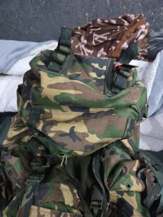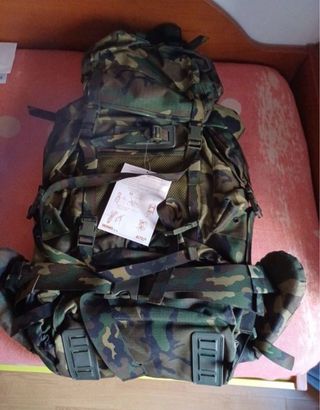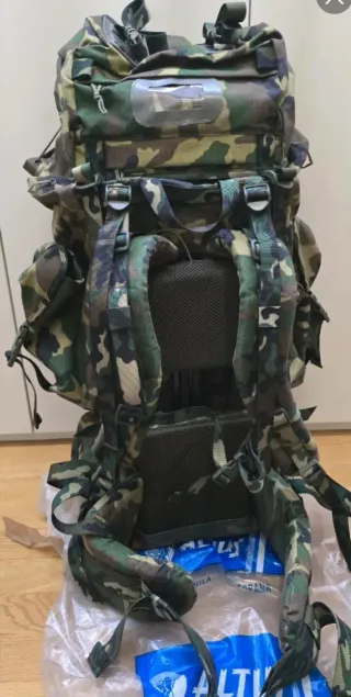 Mochila militar auténtica sin estrenar de gran capacidad de la marca Altus. - Capacidad de 100 litros. - Diseño en camuflaje militar. - regaló saco de dormir militar verde sin estrenar