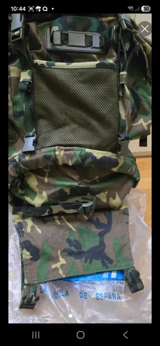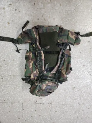 Mochila militar de camuflaje - Diseño clásico con correas ajustables. - Compartimento principal espacioso. - Bolsillo frontal con red. - En buen estado, con señales normales de uso. Lo único que está roto es la parte hembra de la sujeción de cintura. Sería cambiarla y tendrás una mochila en perfectas condiciones de uso.