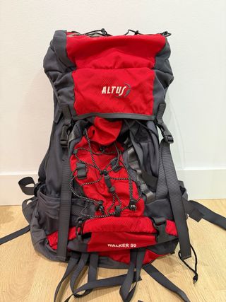 Mochila de senderismo Altus Walker de 50 litros. - Color rojo y gris. - Diseño con múltiples compartimentos y cintas de ajuste. - Cierre superior con cordón y tapa. - Ideal para excursiones y viajes.