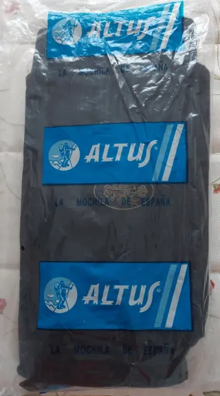 Conjunto de equipo de montaña de la marca Altus. - Mochila principal de gran capacidad. - Saco de dormir acolchado. - Funda impermeable para saco de dormir. - capa para la lluvia