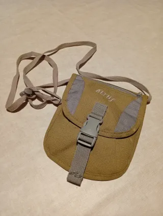 Riñonera Altus modelo Praga en color mostaza con detalles en gris y negro. Perfecta para llevar tus esenciales: documentos de viaje, cartera, móvil, gafas de sol, ... Cuenta con correa ajustable, bolsillo central con cierre de cremallera y otro departamento delantero de red. Como se puede ver, nunca ha sido utilizada y conserva su embalaje original. Medidas en las fotos. Poliéster 100% - Unisex