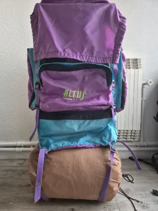 Mochila técnica de la marca Altus, modelo Expedición V. Es de los años 90, con una combinación de colores morado, azul y turquesa. - Capacidad de 40-50L - Cremalleras funcionales y cierres de clip intactos. - Bolsillo frontal de gran tamaño, bolsillos laterales y compartimento principal. - Correas ajustables y sistema de sujeción lumbar para distribuir el peso. - Extras: Incluye el saco de dormir de invierno marca Serval.