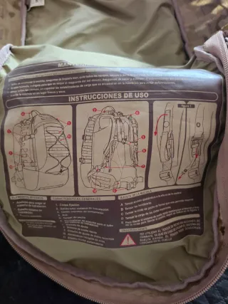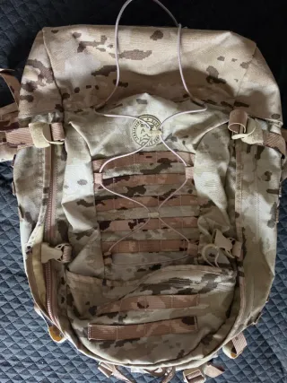 Mochila de de la marca Altus con capacidad de 50 litros. - Diseño de camuflaje árido. - Correas acolchadas. - Cinturón lumbar ajustable. - Sistema molle en casi toda su superficie. -Tiene uso pero está muy cuidada.