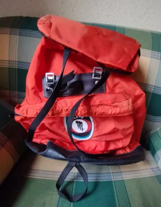 Mochila vintage Altus de los años 70 en color naranja y negro. Un clásico para tus aventuras. Altura 45 CMS. Mochila de colección en perfecto estado incluso para su uso. Ajuste a la espalda metálico. - Diseño de tapa enrollable. - Cierre con correas y hebillas metálicas. - Bolsillo frontal con parche circular. - Base y detalles en material sintético negro.