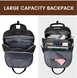 Mochila espaciosa con compartimentos interiores para organización. - Amplio espacio para portátil de hasta 17 pulgadas -Antirrobo El compartimento principal está equipado con un candado con código. En la parte posterior hay un bolsillo con cremallera para objetos de valor -Con un puerto de carga USB en el lateral de la mochila y un cable de carga incorporado, puede cargar fácilmente su teléfono cuando lleve una mochila en movimiento el banco de energía no está incluido). -hecha de nailon de alta densidad y poliéster resistente al desgarro, duradero e impermeable por dentro y por fuera. Hombros acolchados