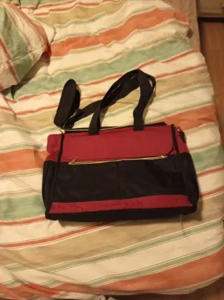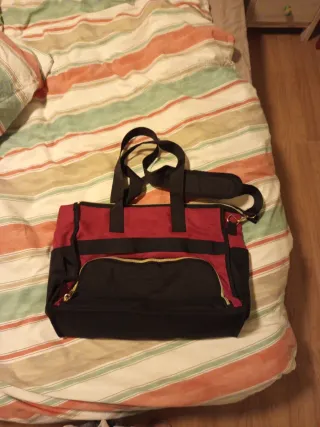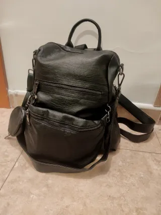 3 en 1: Bolso + Riñonera + monedero, van juntos pero se sueltan para usarlos separados también. La cinta para usar la riñonera, puesta en la mochila sirve como asa larga para el hombro. Tiene muchísimos bolsillos, varios antirrobo (pegados al cuerpo). Está en muy buena condición para lo mucho que se ha usado, pero se ve desgaste. Imitación cuero. 33cm x 31cm x 5.9cm