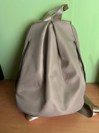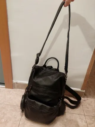 Bolso mochila marron caqui imitacion piel antirrobo. Todas las cremalleras funcionam. Bolsillo anterior, lateral e interior. Buena capacidad. se ajusta para llevar a la espalda. se puede llevar al hombro.