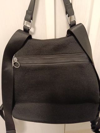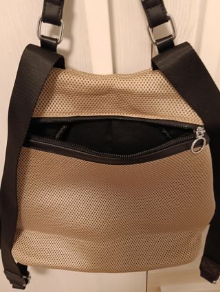 Mochila. Bolso. Antirrobo. Color gris. En el exterior tiene dos bolsillos delanteros con cremallera, y dos laterales abiertos. En el interior tiene un bolsillo con cremallera, y dos bolsillos abiertos. Se puede llevar como mochila, bolso de mano y como bolso de hombro. Asas regulables. Mide: 30 x 24 x 14 cm (alto, largo, ancho). Es de nylon, impermeable. Está como nueva, en perfecto estado.