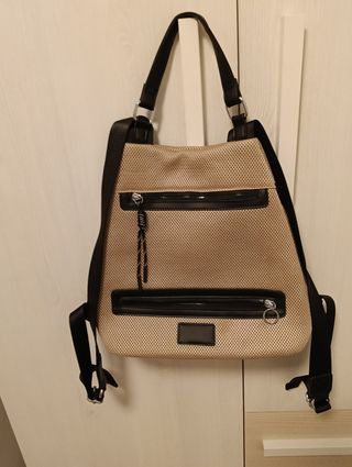 Mochila. Bolso. Antirrobo. Marca Senda Road. Color negro. De polipiel. Se puede llevar como mochila con las dos asas, o como bolso de hombro con el asa superior. Tiene dos bolsillos exteriores frontales y uno lateral que se cierran con cremallera, un bolsillo interior con cremallera y otros dos interiores sin cremallera. Mide: 30,5 x 28 x 9,5 cm (largo, alto, ancho). En perfecto estado.