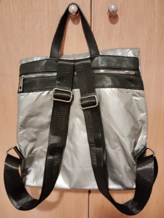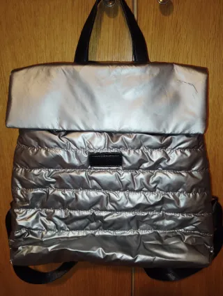 Mochila con un diseño moderno y acolchado. - Bolsillo trasero grande "antirrobo" - Material plateado brillante. - Cierre superior enrollable. - Asa superior y correas ajustables.