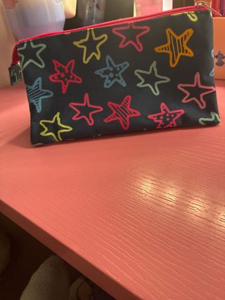 Estuche con un divertido estampado de estrellas de colores. Esta manchado de colores - Diseño con tres compartimentos para organizar tus pertenencias. - Cierre de cremallera.
