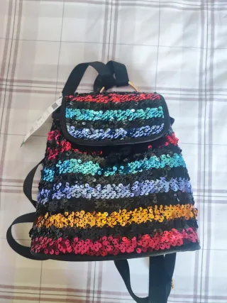 Mochila Benetton con un diseño vibrante y llamativo. - Cubierta con lentejuelas brillantes. - Rayas de colores sobre fondo negro.