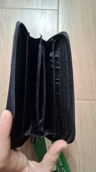 Monedero Benetton tipo bolsa negro grande pero.no cabe el movil.udado en un par de ocasiones en perfecto estado - Cierre de cremallera. - Asa de mano. - Acabado tipo piel de cocodrilo.