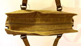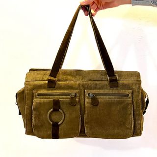 Bolso de pana con un diseño moderno y práctico. - Color marrón y verde oliva. - Cierre de cremallera principal. - Dos bolsillos frontales con cremallera. - Detalle de anilla metálica y tira de ante.