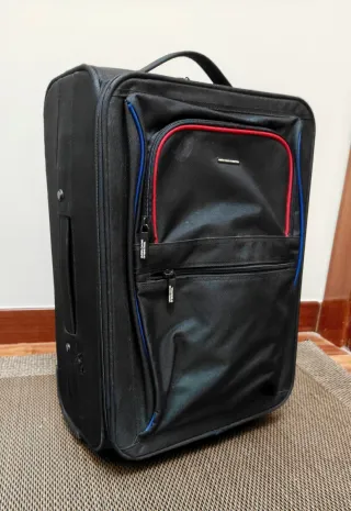 Maleta semirrígida de la marca Benetton. Perfecta para tus viajes. Medidas: 54x35x22 cm - Color negro. - Diseño con varios compartimentos y cremalleras.