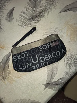 Estuche de la marca Benetton con un diseño moderno y llamativo. Perfecto para llevar tus esenciales. - Estampado de letras en contraste. - Ribete superior en color gris metalizado. - Incluye una pequeña correa para muñeca.