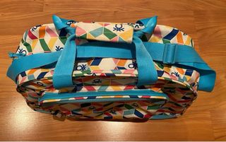 Bolsa de deporte con un diseño vibrante y llamativo. - Colores: rojo, azul, amarillo y verde. - Asas negras para llevarla cómodamente. - Bolsillos laterales de malla. Está usada y tiene alguna mancha pero en perfectas condiciones, la cremalleras funcionan perfectamente.