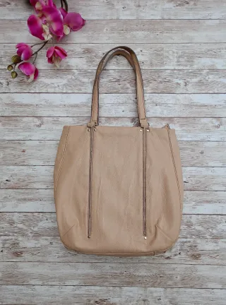 Bolso de mujer, marca United Colors of Benetton. Color rosa palo. Dos asas. Cierre superior con cremallera. Tiene 3 bolsillos en el interior, uno de ellos con cremallera. Estilo tote, tamaño mediano. Medidas (aprox): 30cm largo x 30cm ancho x 8cm fondo. Material exterior: 100% poliuretano; forro interior: 90% poliéster, 10% algodón. Tiene las asas y un filo de la parte superior algo estropeado (ver últimas fotos) y un asa algo descosida, se puede reparar con facilidad. Por lo demás, en buenas condiciones.