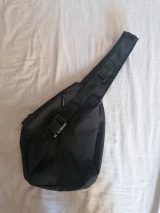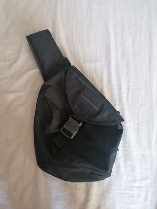 Mochila bandolera vintage de color negro con tres compartimentos de united colors of benetton.