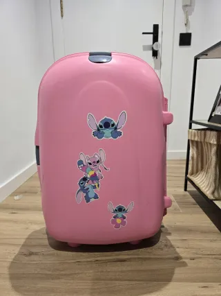 Maleta de la marca Benetton en color rosa. Cuenta con un diseño divertido con pegatinas de Stitch. - Diseño con pegatinas de Stitch. - Asa extensible para facilitar el transporte. - Ruedas para un desplazamiento suave.