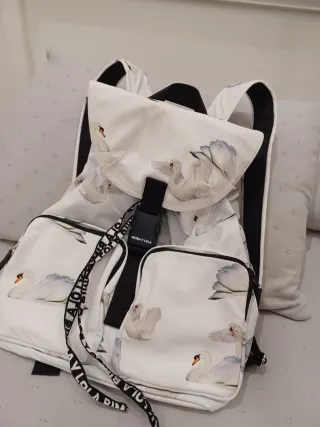 Lo más importante: se compró, se guardo y está SIN ESTRENAR. Es una preciosidad, totalmente atemporal. Mucha capacidad. Tela cómo sintética de cisnes. No lleva cartón así que se puede lavar sin problema en la lavadora. Pero con bolsa de protección. Bolsillo interior y dos delanteros. El precio es un REGALO. Medida aproximada unos 40 x36 cm Más cosas especiales en mi perfil 😍😍😍
