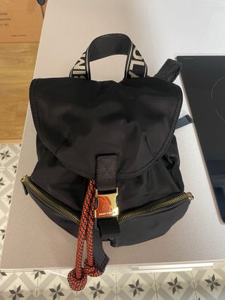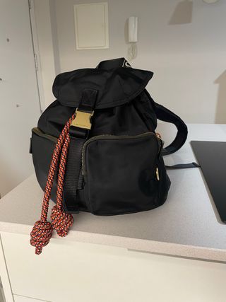 Mochila de la marca Bimba y Lola. - Cierre con cordón y hebilla. - Dos bolsillos frontales con cremallera. - Dos asas ajustables. - Detalle de cuerdas decorativas.