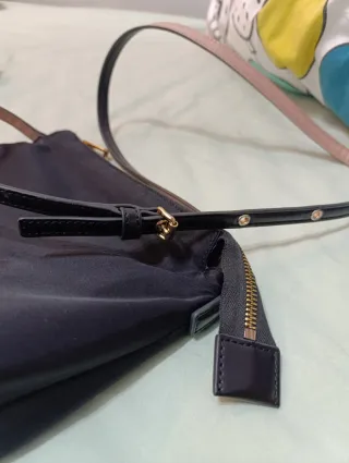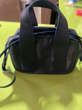 Bolso de nylon en color azul marino con detalles en negro y herrajes dorados. - Asa de mano y correa ajustable. - Placa metálica con el logo de la marca en la parte frontal.