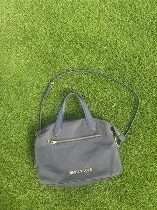 Bolso de la marca Bimba y Lola en tonos azul y gris. Diseño moderno y práctico. - Compartimento principal con cierre de cremallera. - Bolsillo frontal con cremallera. - Correa ajustable para llevar al hombro o cruzado. - Detalle del logo de la marca.