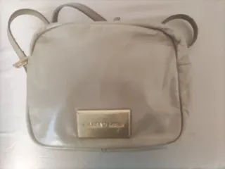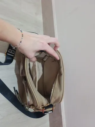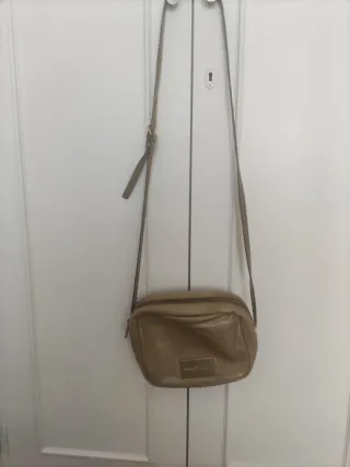 Bolso de Bimba y Lola original en piel color beige, bastante utilizado con signos de uso como se ve en las fotos, pero con cremalleras y bandolera funcionales.