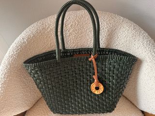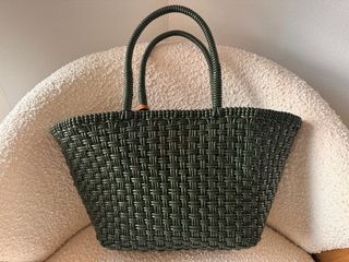 Bolso capazo de Bimba y Lola en color verde. Un accesorio versátil y con estilo. - Diseño tejido. - Asa de mano. - Detalle de charm circular.
