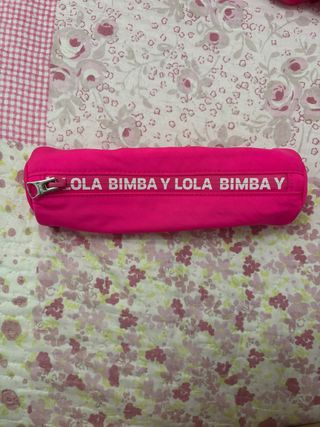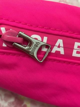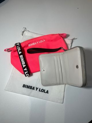Set de neceser y cartera de la marca Bimba y Lola. - Neceser de color rosa vibrante con detalle de correa. - Cartera de color beige con cierre de cremallera.