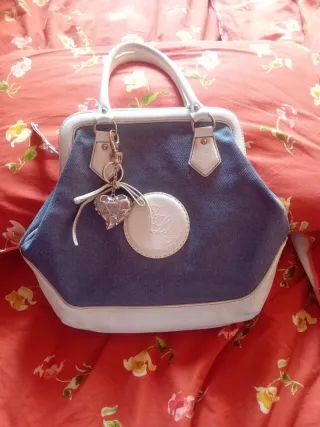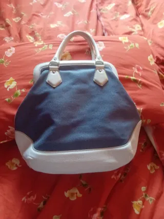 Bolso de mano con un diseño moderno y llamativo. - Combinación de colores azul y blanco. - Placa dorada con el logo de la marca en la parte frontal.