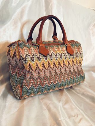 Bolso bombonera de Bimba y Lola con un diseño llamativo. - Base y detalles en piel. - Tejido con estampado multicolor. - Cierre con cordón. Conserva bolsa de tela original