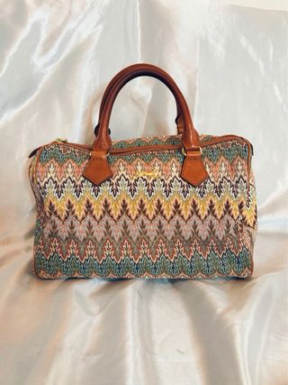 Bolso estilo bowling de Bimba y Lola con un diseño vibrante y llamativo. 30x20 cm. - Estampado geométrico en zig-zag. - Detalles en piel. - Asas de mano. - Cierre de cremallera.