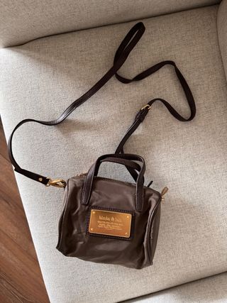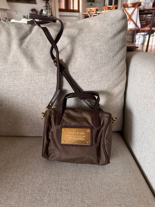 Winter collection 2010. Nylon marron (material muy duradero) y placa dorada. Las asas son de piel o simil. Los detalles de cremallera, enganches y adornos son dorados. El metal tiene algun desgaste de los años y le placa dorada tiene algun rayoncillo. Tamaño: 15x12 aprox.