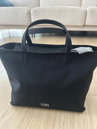Bolso shopper mediano nylon negro, de la marca Bimba y Lola. Precio en web 87€ Estructura blanda Medidas aproximadas: 37 x 21 x 16 cm Doble asa de mano y asa de tejido Logo metálico BIMBA Y LOLA Acabados metálicos en plateado Bolsillo interior Cierre de cremallera Interior con etiqueta de tejido BIMBA Y LOLA