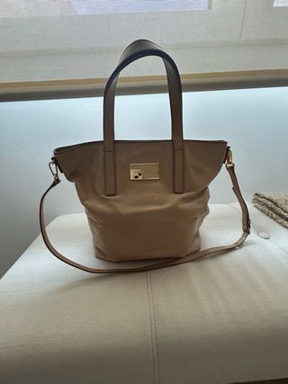 Bolso de mano con un diseño moderno y elegante. - Compartimento principal con cierre de cremallera. - Asas de mano y correa ajustable. - Placa metálica con el logo de la marca.