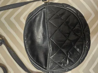 Bolso pequeño de piel con diseño acolchado. - Material: Piel. - Color: azul oscuro, casi negro - Diseño acolchado. - Forma redonda. En el interior del bolsillo externo el forro está manchado, pero no se ve nada en el exterior.