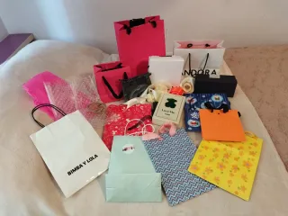 Conjunto de bolsas y cajas de regalo de diferentes marcas y diseños. - Incluye bolsas de Bimba y Lola, Pandora y Tous. - Variedad de colores y estampados. - Algunas cajas son rígidas y otras son bolsas de papel.