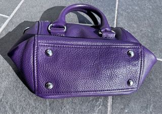 Bolso de mano de piel en color morado. Estrenado un día. Se customizó para eliminar la cinta para colgar del hombro y se hizo un porta llaves en el interior. Ahora solo se puede llevar con las asas de mano. Por lo demás, impecable. En perfecto estado.