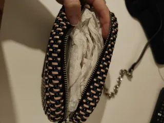 Bolso de la marca Bimba y Lola, completamente nuevo y sin usar. - Diseño tejido en tonos azul marino y rosa palo. - Con cadena plateada. - Etiqueta de la marca visible.
