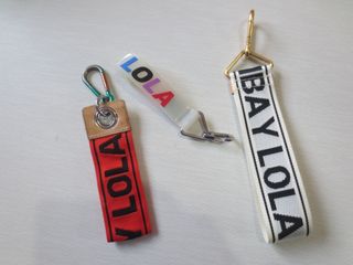 Conjunto de tres llaveros de la marca Bimba y Lola. Nuevos sin estrenar - Llavero con cinta blanca y letras negras. - Llavero con cinta roja y letras negras. - Llavero con cinta transparente y letras de colores.