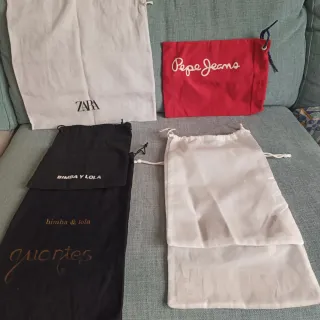 5€/ todas Lote de seis bolsas de tela para guardar complementos, zapatos o accesorios. - Dos bolsas blancas, una con logo de Zara. - Una bolsa roja con logo de Pepe Jeans. - Tres bolsas negras, dos de Bimba y Lola y 2 de BIMBA.